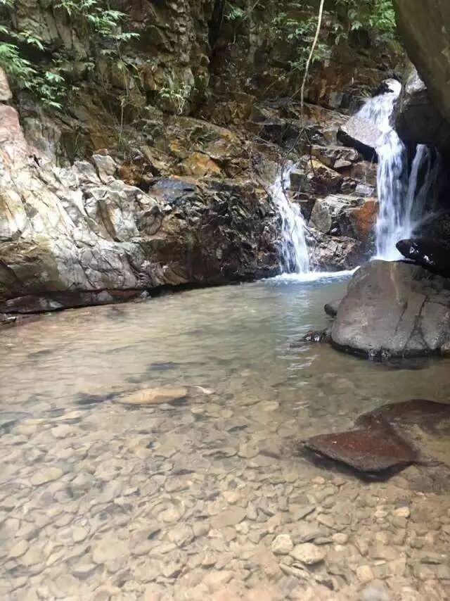 溯溪而上二十分钟,一股清凉扑面而来,看见了第一个小瀑布。每个人都很开心,去瀑布合影留念。