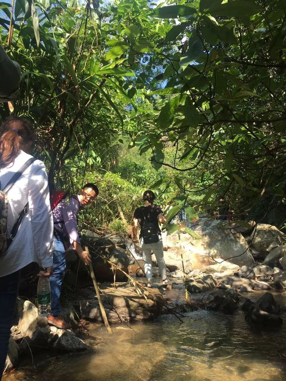 溯溪而上,蓝天碧水,山间清泉,树丛挡去了炽热的阳光,很是凉爽。一路身手矫捷的伙伴伸手帮助其他伙伴,玩笑间“情不知所起”。